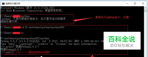 打开命令提示符,直接输入python运行出错。切换到安装目录,再次输入python,正常运行,如下图所示: