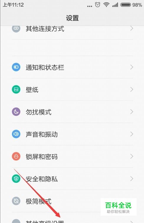 打开红米Note手机的设置界面,然后点击“其它高级设置”菜单项